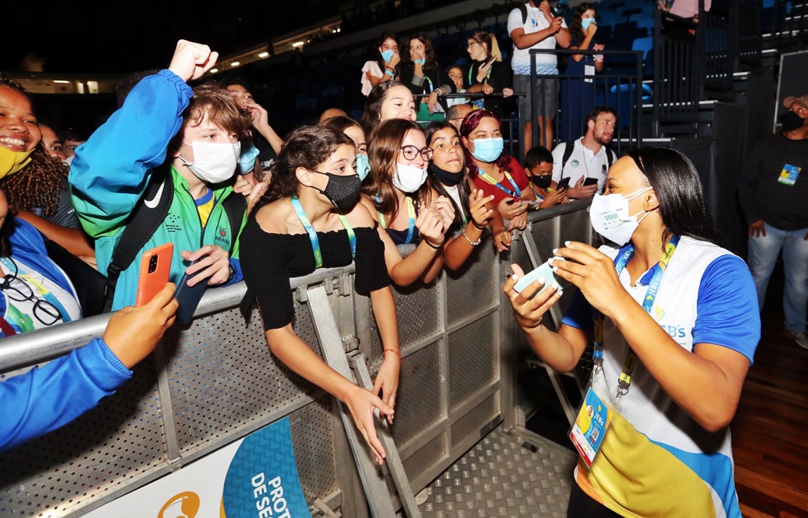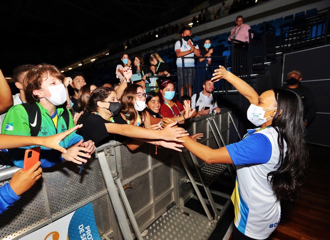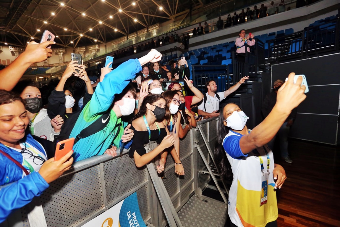 Campeã olímpica e embaixadora dos JEB's, Rebeca Andrade foi "tietada" pela criançada na festa de encerramento. Foto: Ronaldo Caldas/ Min. Cidadania