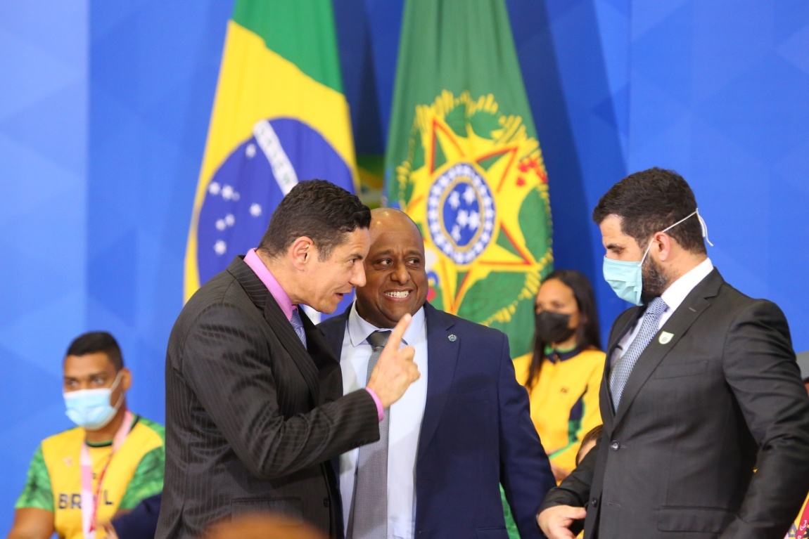 Os secretários Marcelo Magalhães e Agtônio Guedes com o presidente do Comitê Paralímpico Brasileiro, Mizael Conrado. Foto: Júlio Dutra/ Min. Cidadania