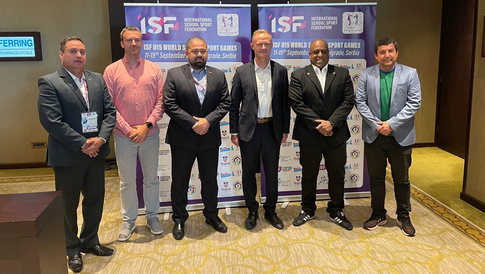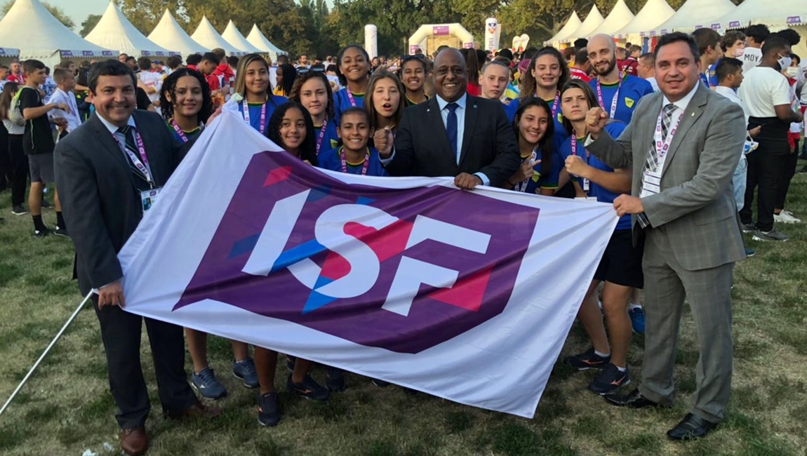 Representantes do Governo Federal e da CBDE com integrantes da Federação Internacional do Desporto Escolar no Mundial Sub-15, na Sérvia. Foto: CBDE