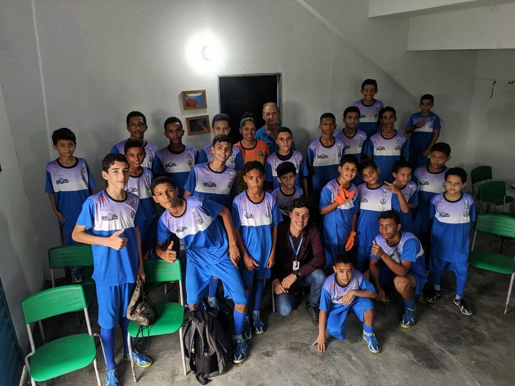 Atuais integrantes do projeto reunidos com Ygor, ex-aluno do projeto e atualmente nas categorias de base do Vitória (BA). Foto: Divulgação/Inclusão Social Através do Futebol