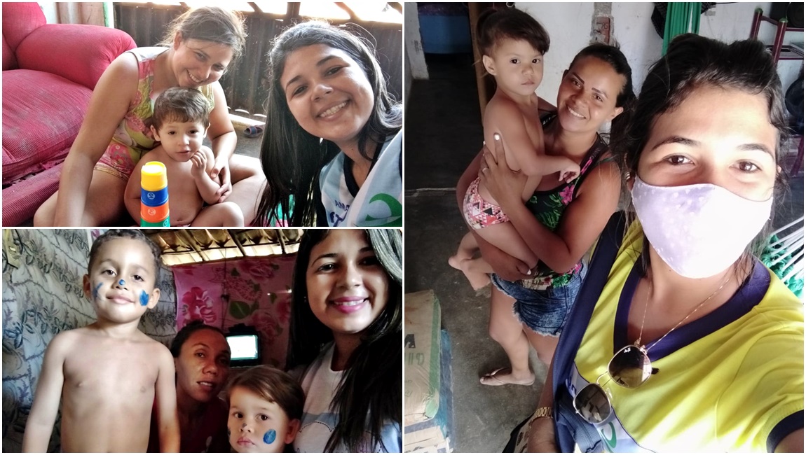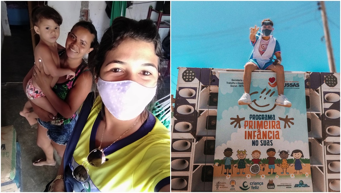 Rosana antes e depois da pandemia em Pentecoste (CE): uso de EPIs e entrega de atividades para suporte a famílias que não tinham estrutura para atendimento digital. Fotos: Arquivo pessoal