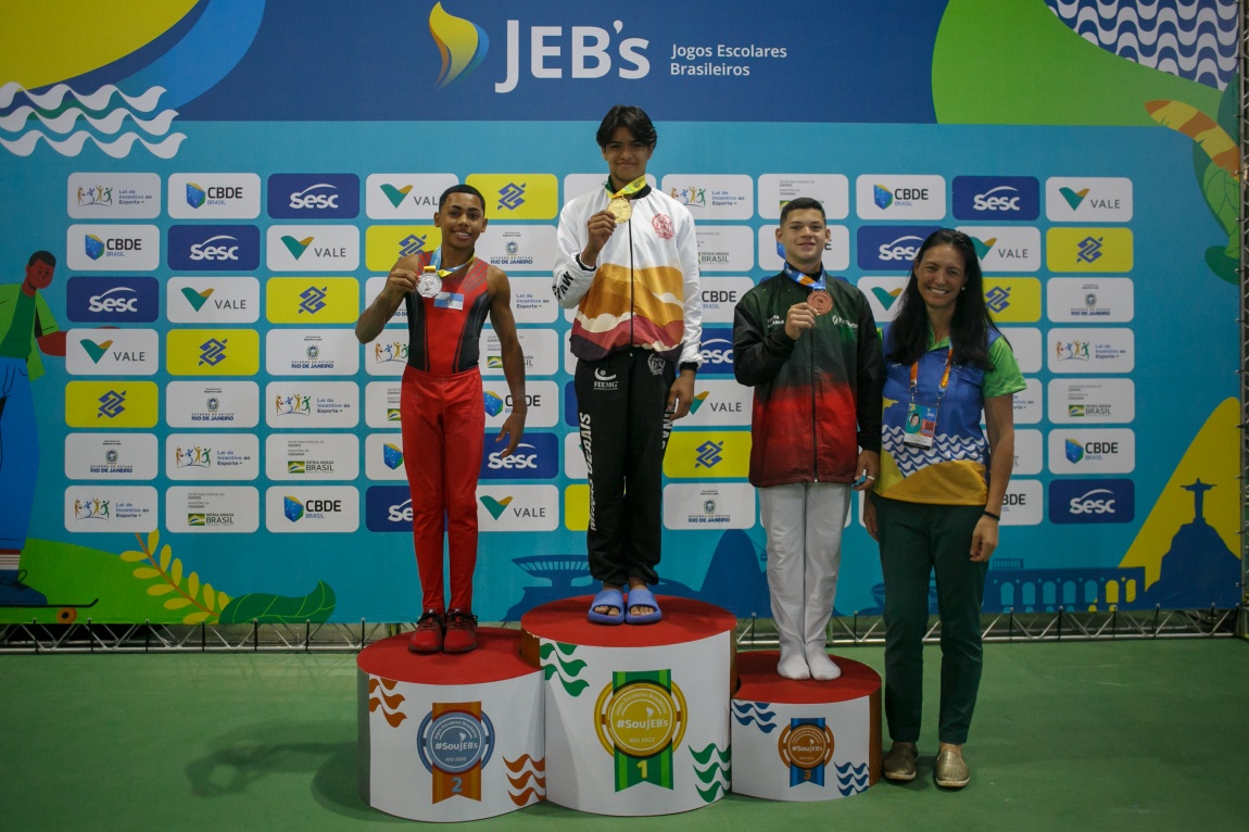 Primeiros medalhistas saíram na ginástica artística. Yago Lima (MG) foi campeão no individual geral. Ao lado dele, Rafael Araújo (RJ) e Gabriel de Souza (SC). Premiação entregue pela secretária de Lazer e Inclusão Social do Ministério da Cidadania, Fabiola Molina. Foto: Claudia Martini/ Min. Cidadania