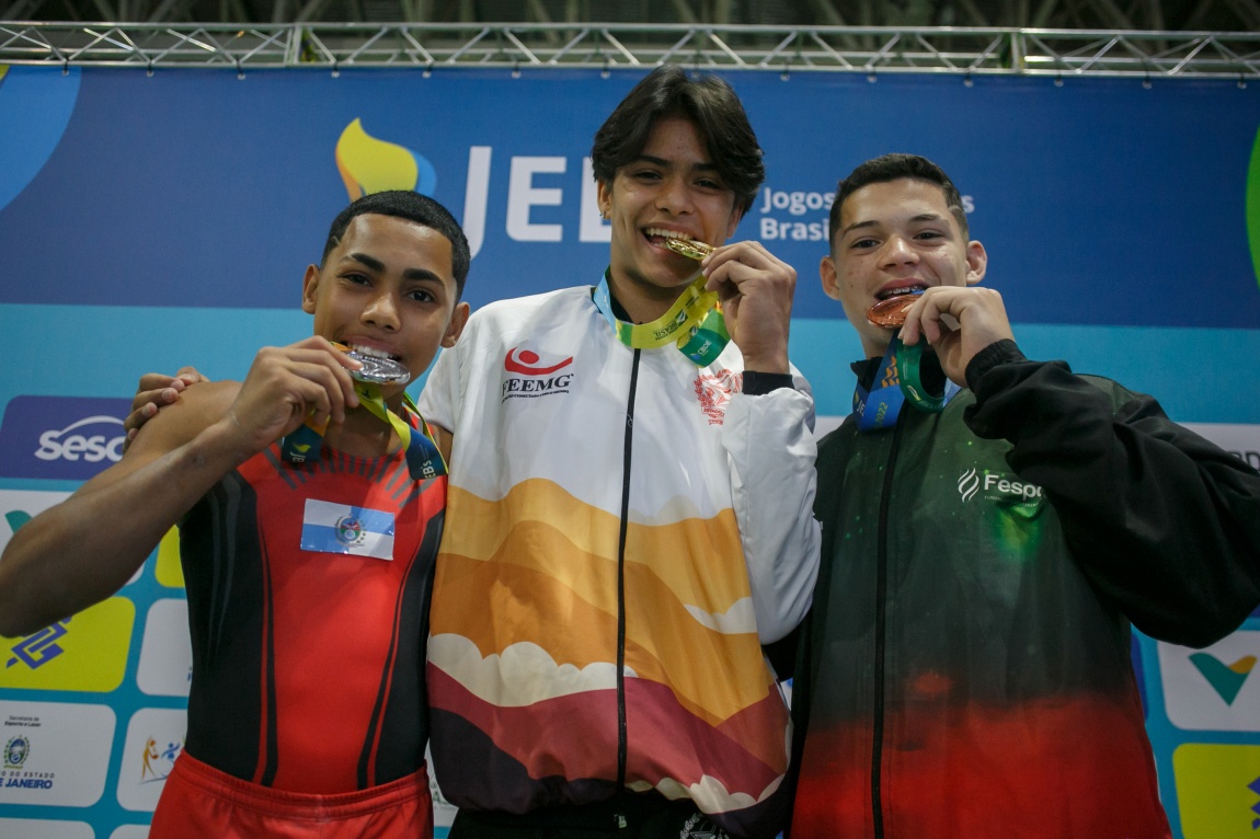 Primeiros medalhistas saíram na ginástica artística. Yago Lima (MG) foi campeão no individual geral. Ao lado dele, Rafael Araújo (RJ) e Gabriel de Souza (SC). Foto: Claudia Martini/ Min. Cidadania