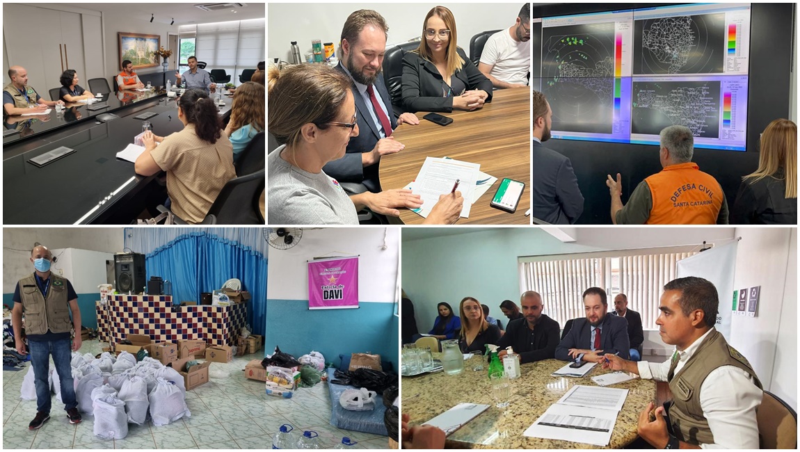 O ministro Ronaldo Bento (abaixo, à direita) e equipes técnicas do Ministério da Cidadania visitaram municípios de Santa Catarina e do Espírito Santo atingidos pelas chuvas. Fotos: Divulgação/ SNAS/ Min. Cidadania