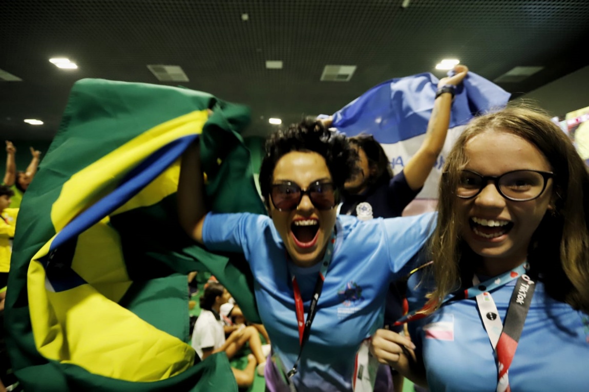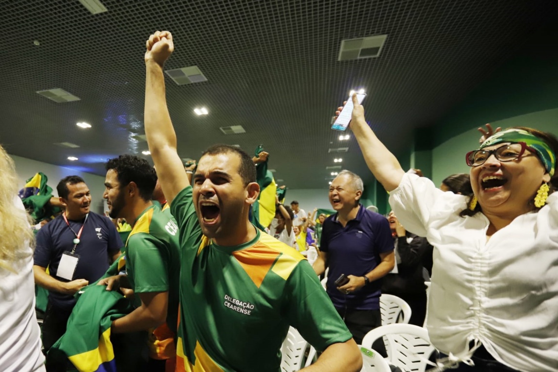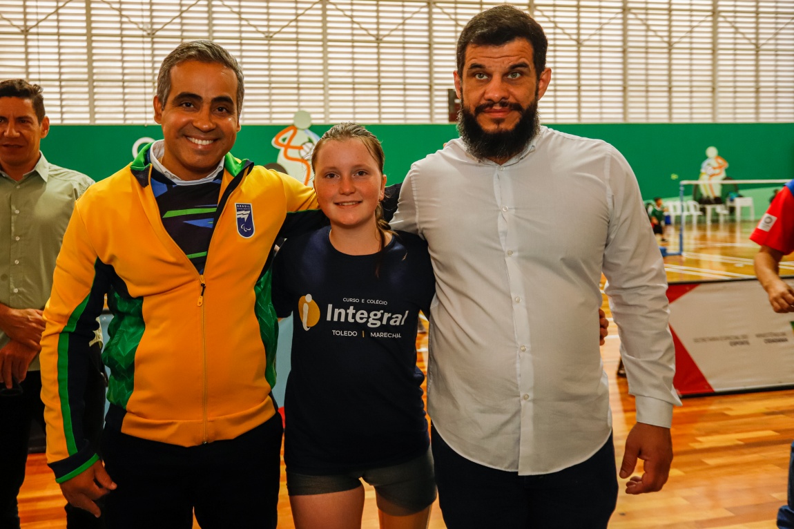 O presidente do CPB, Mizael Conrado, o ministro da Cidadania, Ronaldo Bento, e o secretário nacional de Paradesporto, Agtônio Guedes, com atletas e familiares nas Paralimpíadas Escolares. Foto: Ricardo Valarini/ Min. Cidadania