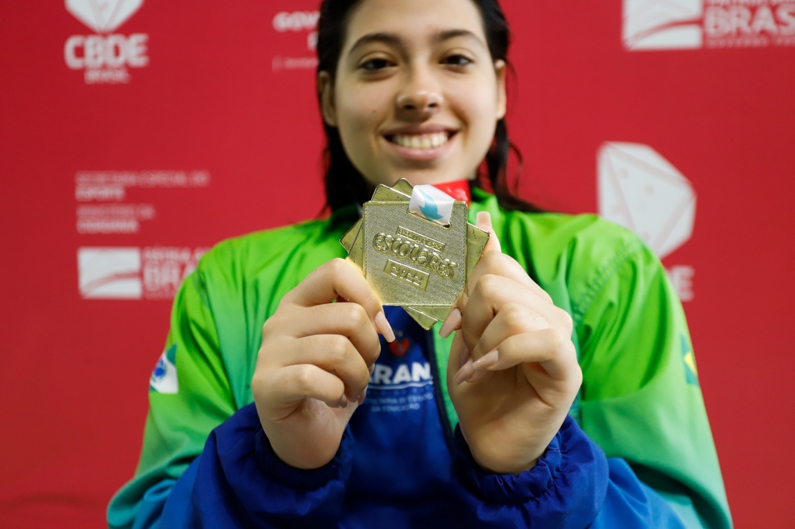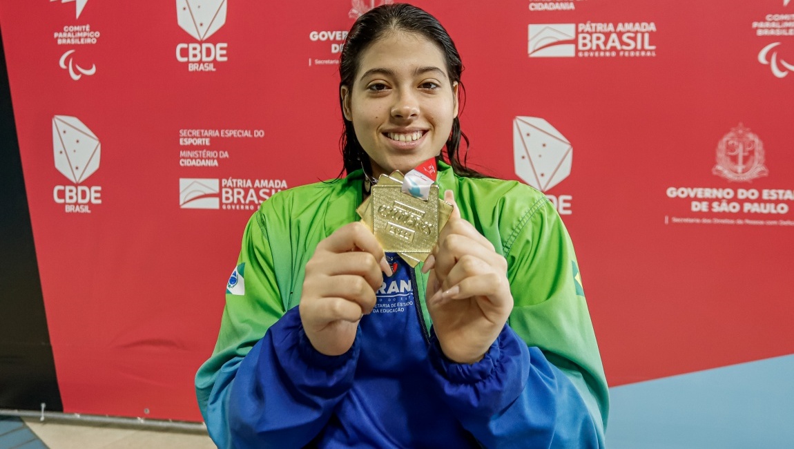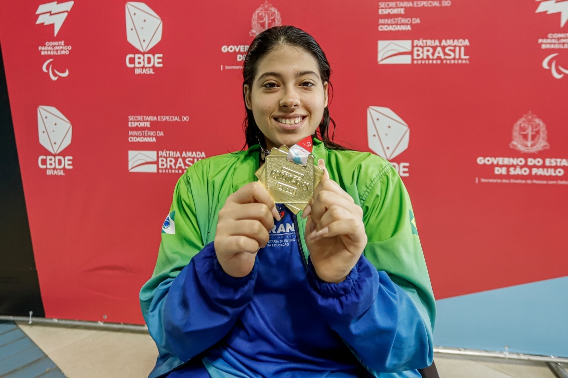 Emanuelle com a medalha de ouro dos 50m livre da classe S6 da natação. Foto: Ricardo Valarini/ Min. Cidadania