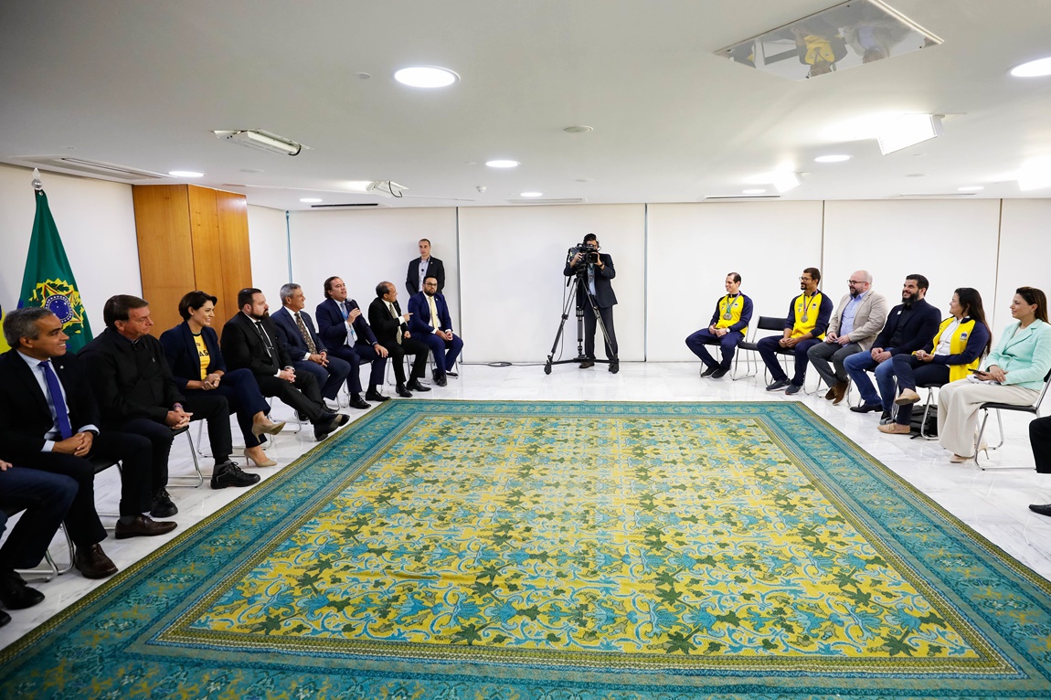 Encontro de medalhistas brasileiros nas Surdolimpíadas com o presidente Jair Bolsonaro, a primeira-dama, Michelle Bolsonaro, e ministros. Foto: Alan Santos/PR