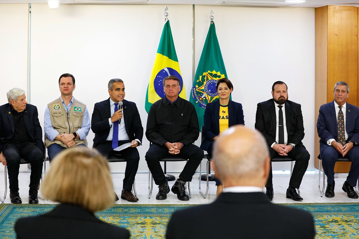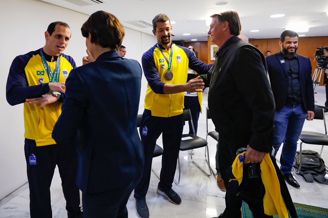 Encontro de medalhistas brasileiros nas Surdolimpíadas com o presidente Jair Bolsonaro, a primeira-dama, Michelle Bolsonaro, e ministros. Foto: Alan Santos/PR