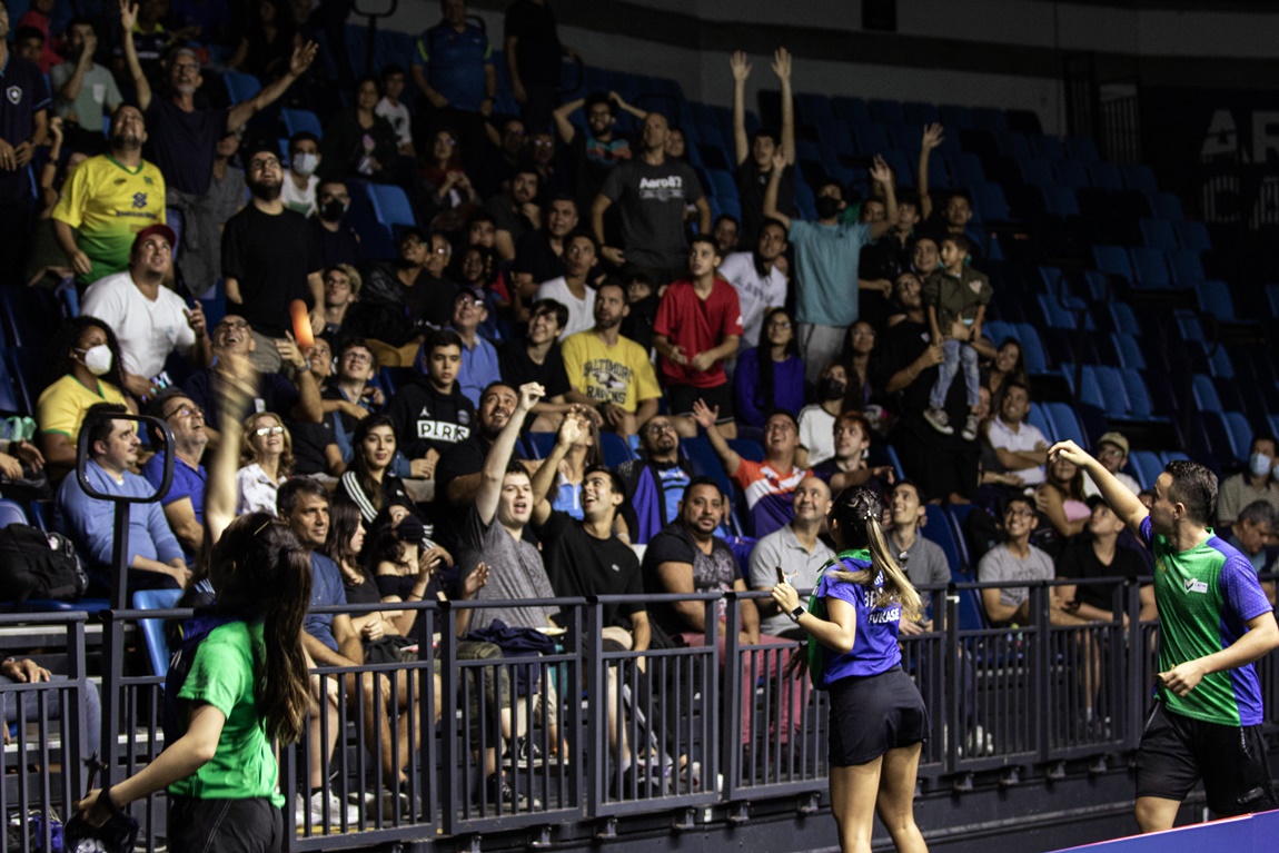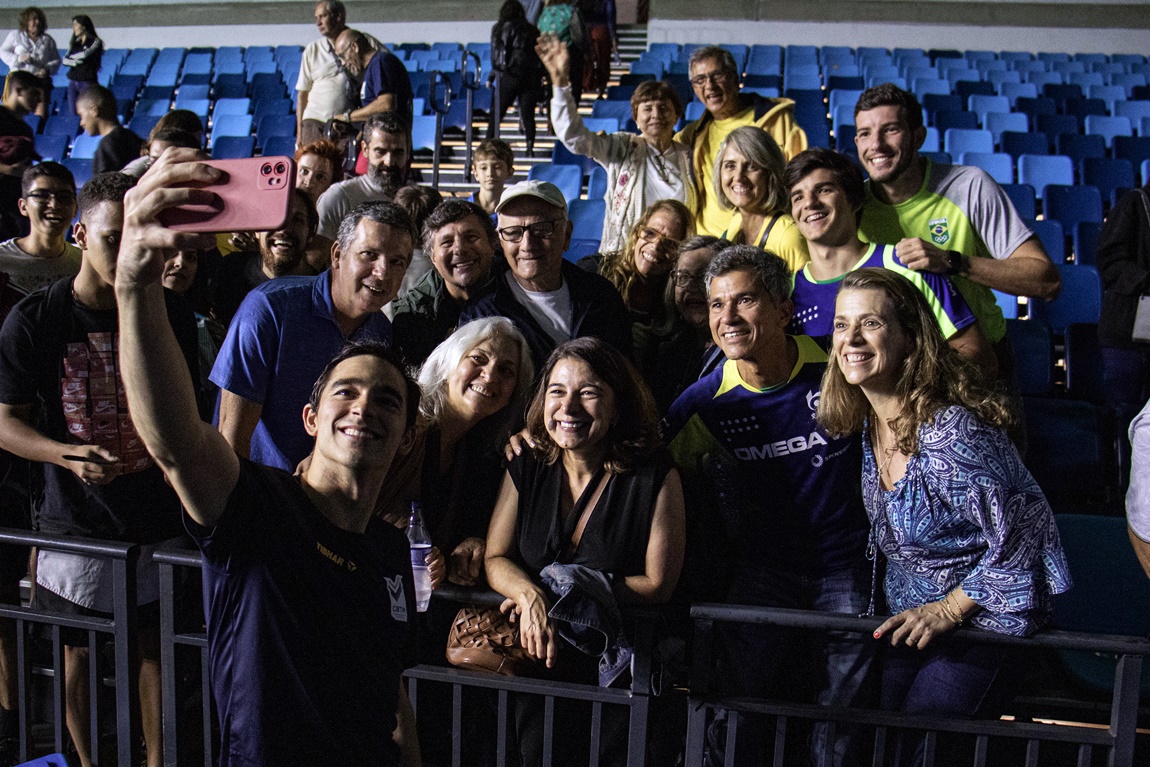 Hugo Calderano faz selfie com familiares e fãs na Arena Carioca 1. Foto: Luis Miguel Ferreira/CBTM