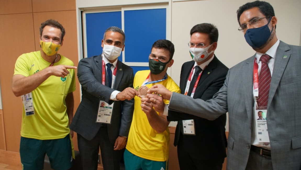 O ministro João Roma se encontrou com o judoca Daniel Cargnin, medalhista de bronze na categoria -66kg. Foto: Rodolfo Vilela/Min. Cidadania