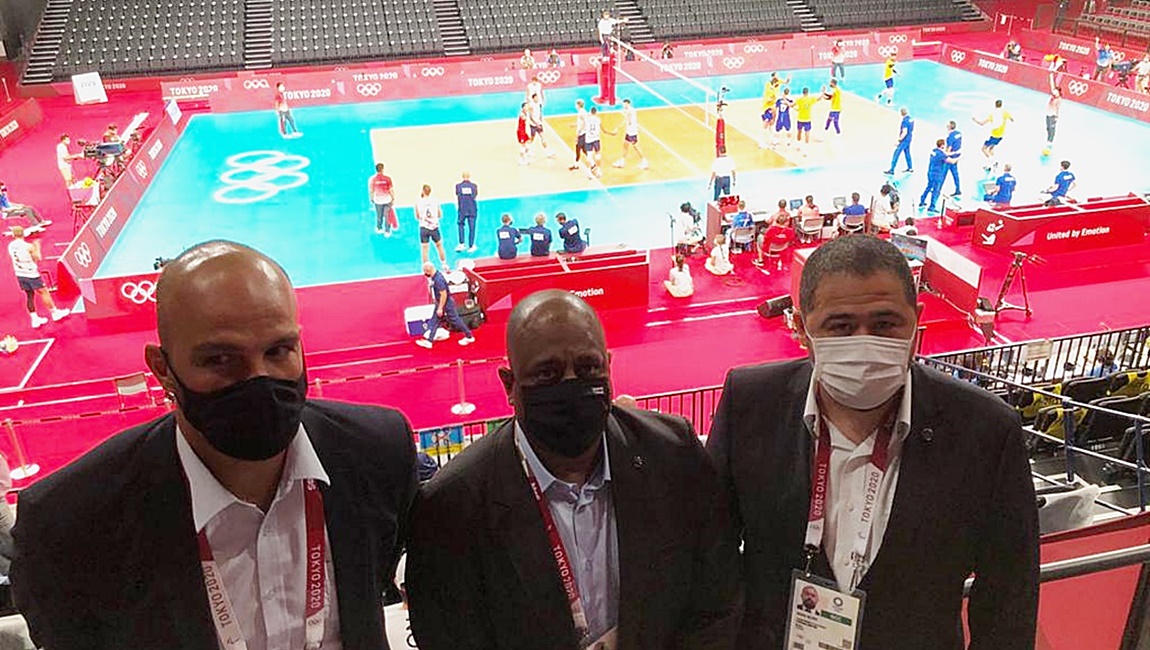 Bruno Soares, Marcelo Magalhães e André Alves, no jogo de vôlei entre Brasil e Estados Unidos. Foto: Luiz Roberto Magalhães/Ministério da Cidadania