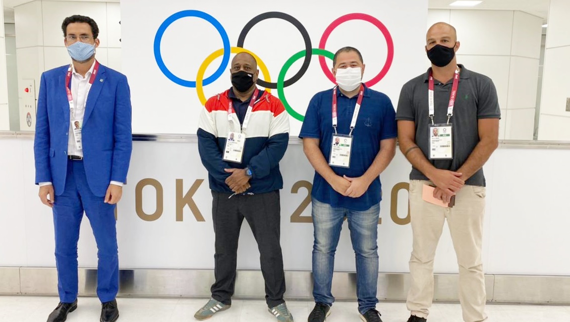 O embaixador do Brasil no Japão, Eduardo Saboia, Marcelo Magalhães, André Alves e Bruno Souza, na chegada a Tóquio. Foto: rededoesporte.com.br