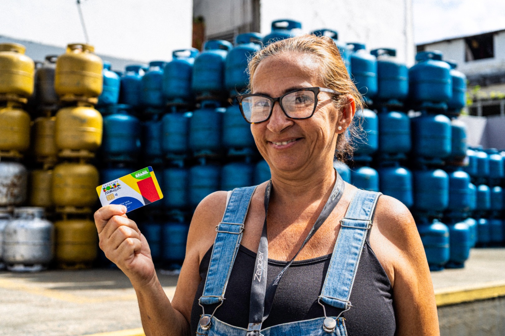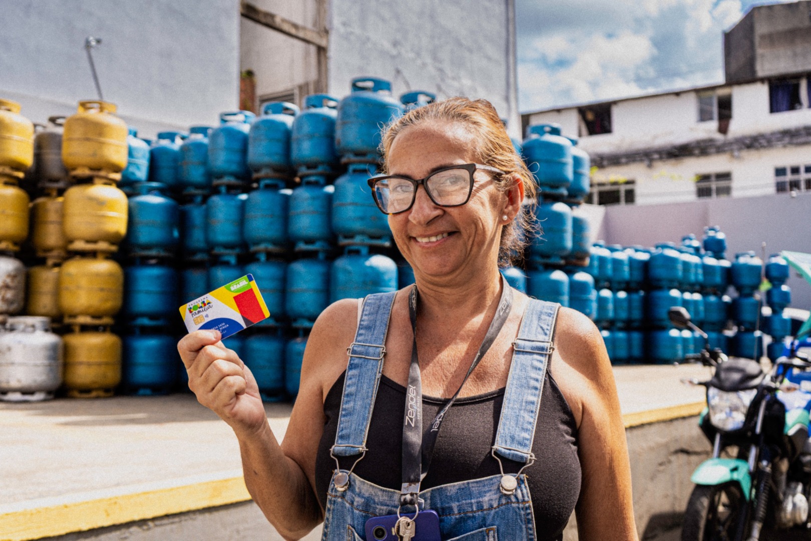 Beneficiária do Bolsa Família e do Gás do Povo, Viviane Souza retirou botijão de gás gratuito nesta segunda-feira (24.11), em Salvador. Fotos: Mayara Vita/ MDS