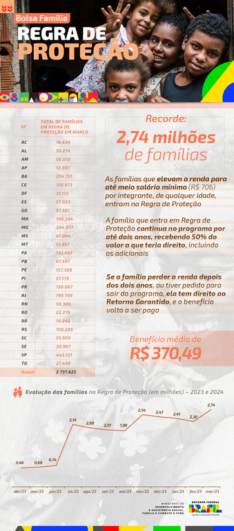 No mês do primeiro aniversário da retomada do Bolsa Família, 2,74 milhões de domicílios se encontram na Regra de Proteção, número recorde na história do programa. Somente em março, 601,83 mil famílias entraram nesta condição, uma das novidades do novo modelo de transferência de renda. O benefício médio para elas, neste mês, é de R$ 370,49.