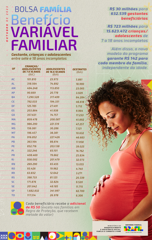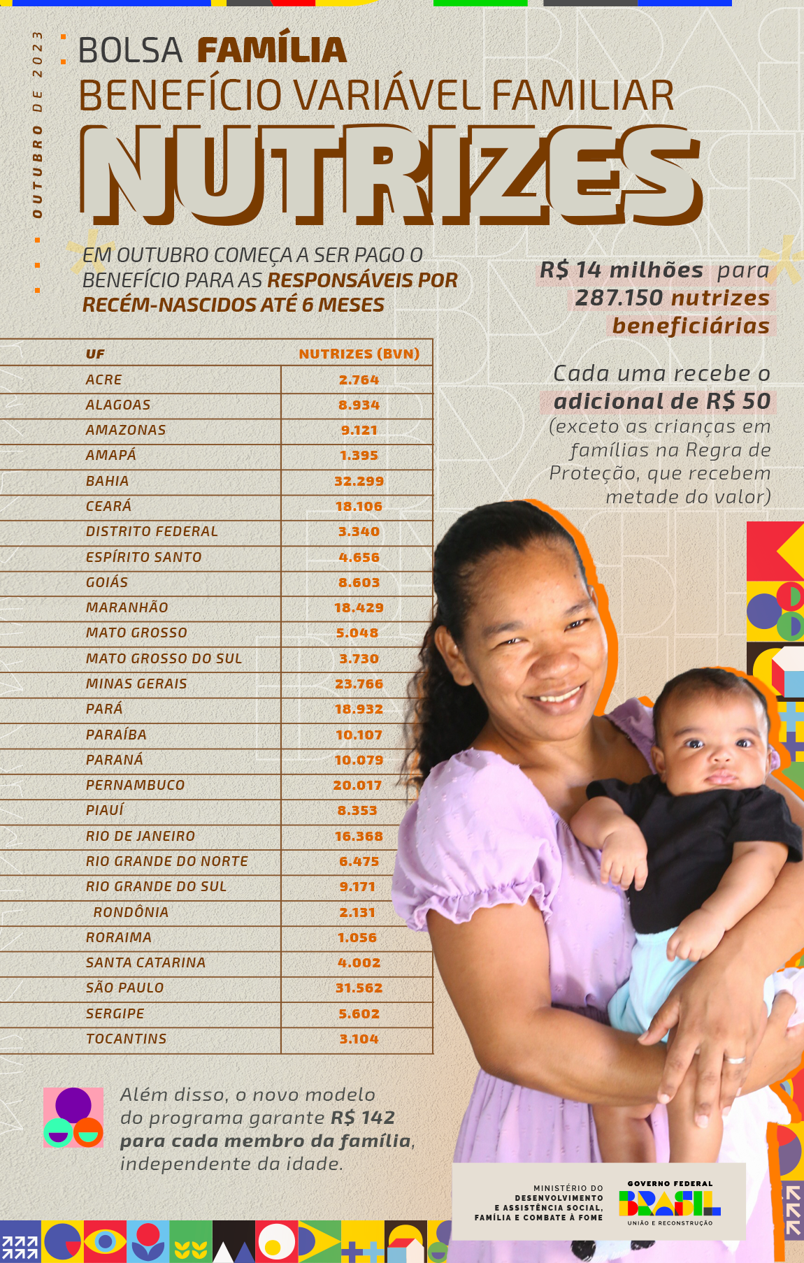 O acréscimo no benefício é motivado pelo início do pagamento do Benefício Variável Familiar Nutriz, a partir desta quarta-feira (18.10). A novidade na cesta de benefícios do Bolsa Família corresponde a seis parcelas de R$ 50 para auxiliar nos primeiros meses de vida de um bebê. O objetivo é conferir maior proteção social e qualidade nutricional para as mães (ou responsáveis) e para os bebês de até seis meses.