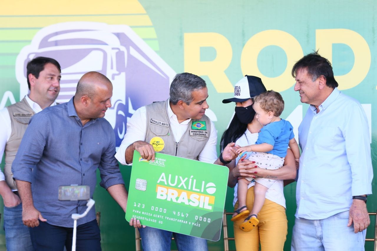 Além da estação do Roda Bem Caminhoneiro, o ministro Ronaldo Bento realizou a entrega simbólica do cartão Auxílio Brasil para Fernanda Eduarda da Silva, de 19 anos. Mãe de dois meninos, ela cria sozinha as crianças de um e três anos e conta com o benefício para garantir seu sustento.