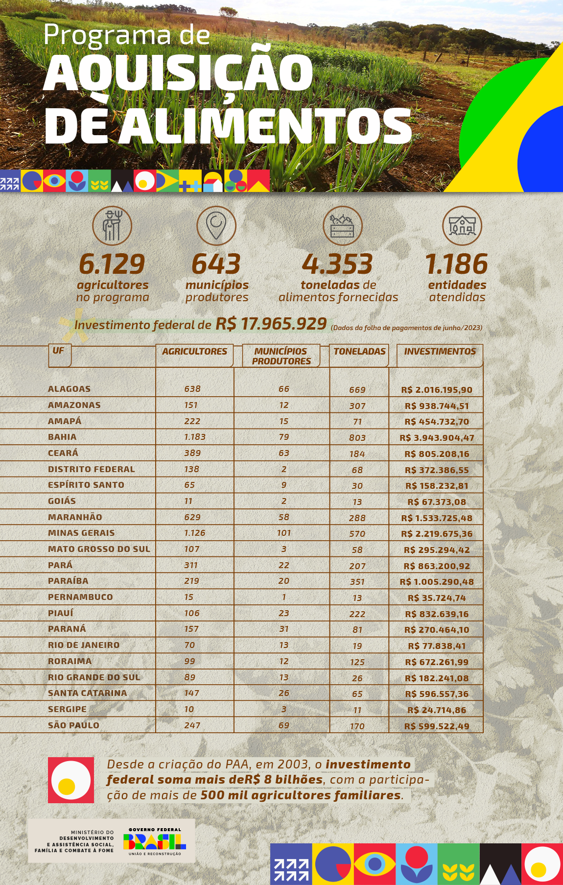 Desde 2003, o investimento federal na iniciativa já soma mais de R$ 8 bilhões, com a participação de mais de 500 mil agricultores familiares. Nos últimos anos, o programa foi extinto pela antiga gestão do Governo Federal. Já em março deste ano, o presidente Lula relançou o PAA por meio da Medida Provisória nº 1.166 . Em abril, o Decreto nº 11.476 regulamentou o funcionamento do programa.