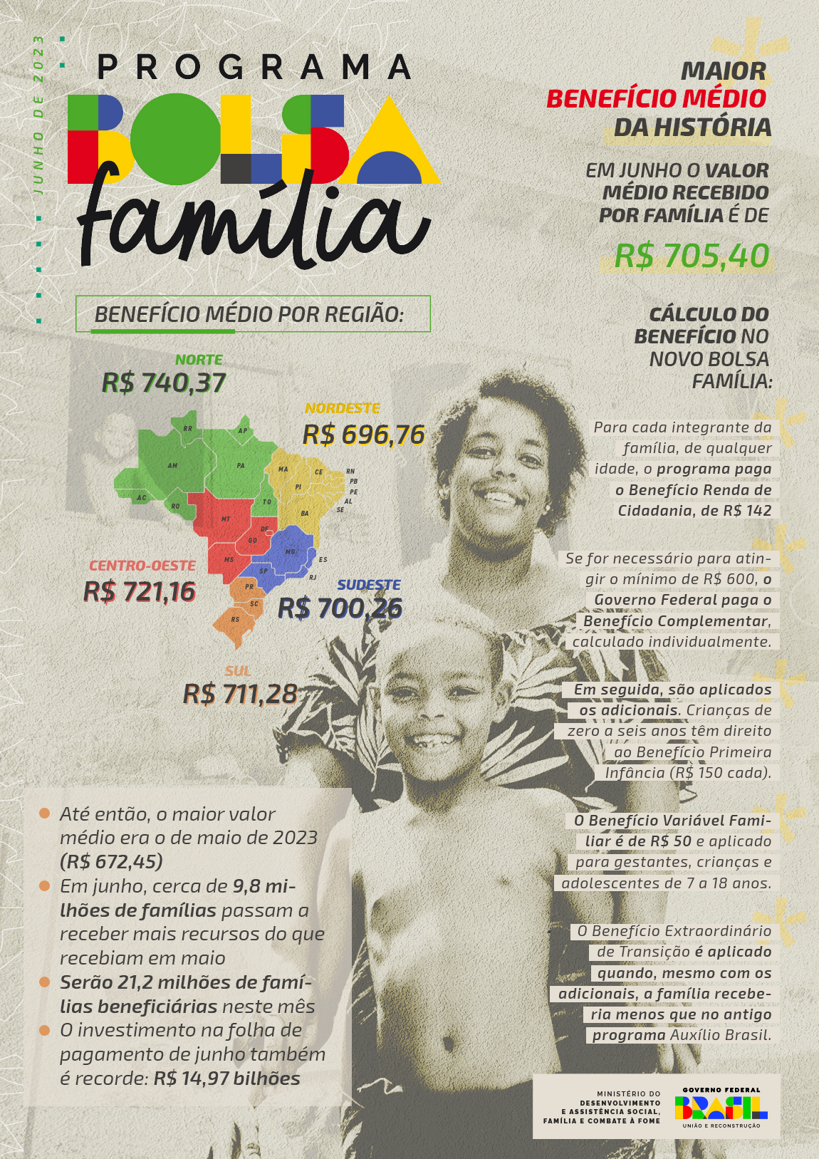 A nova versão do Programa Bolsa Família está completamente implementada. A partir desta segunda-feira (19.06), os beneficiários começam a receber os pagamentos de junho já com os adicionais de R$ 50 destinados a gestantes, crianças e adolescentes de 7 a 18 anos, além dos acréscimos de R$ 150 para a primeira infância que vêm sendo pagos desde março. Com isso, o benefício médio recebido por cada família será o maior da história do programa de transferência de renda: R$ 705,40.