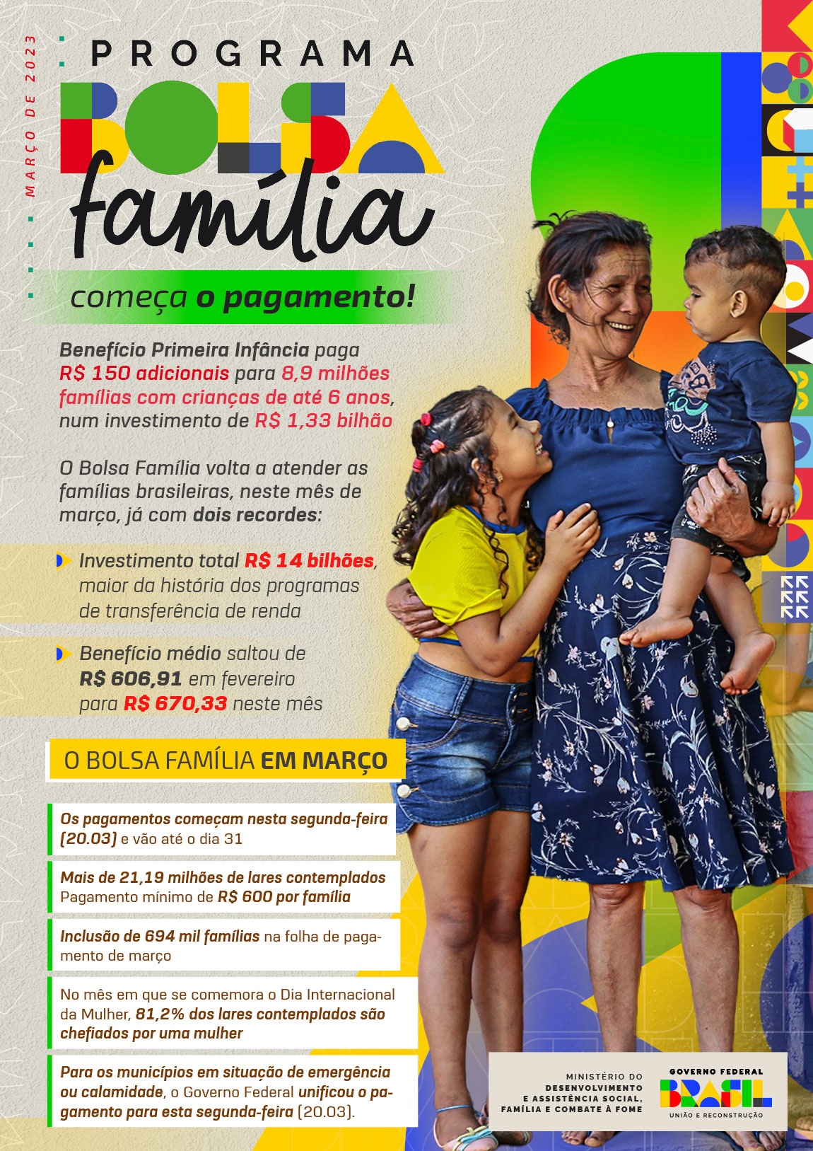 Em março, o investimento federal no Bolsa Família supera a marca de R$ 14 bilhões, valor recorde na história dos programas de transferência de renda. Além disso, o Governo Federal começa a pagar os R$ 150 adicionais por criança de até seis anos, priorizando a composição familiar e a primeira infância.