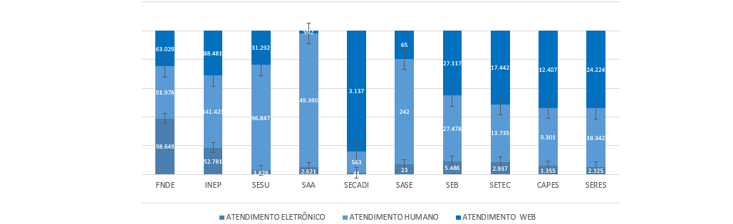 Os multicanais de atendimento recebem e tratam demandas direcionadas ao MEC e a três de suas autarquias: FNDE, Inep e Capes. Em 2023, o atendimento pelos multicanais totalizou 887.529 demandas da sociedade. No Gráfico 1, apresenta-se o quantitativo de atendimentos demandados, organizados por unidade e tipo de canal.
