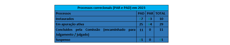 Somando-se aos processos correcionais instaurados em anos anteriores, atualmente, há 29 (vinte e nove) processos em curso. Desses, 4 (quatro) são Processos Administrativos de Responsabilização (PAR) e 25 (vinte e cinco) são Processos Administrativos Disciplinares(PAD).
