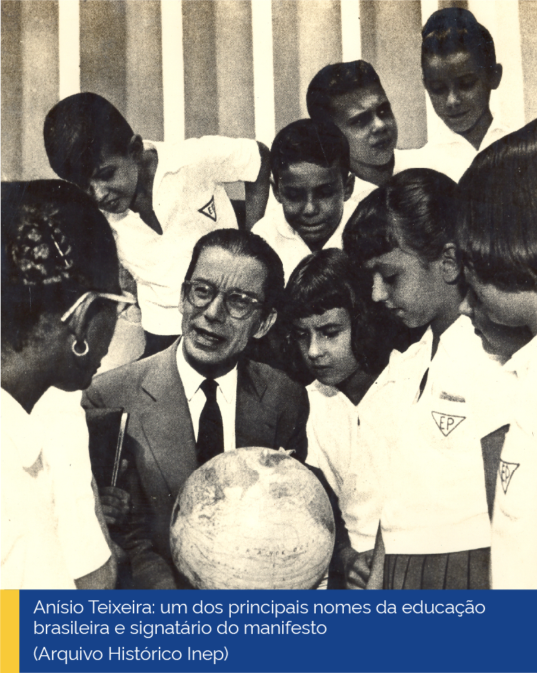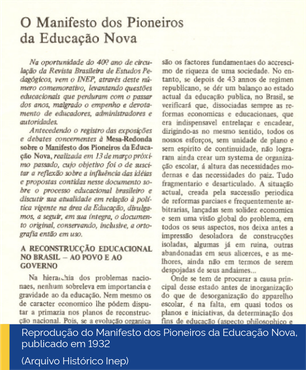 Em 1932, foi lançado o Manifesto dos Pioneiros da Educação Nova, que tinha como proposição um sistema escolar público, gratuito, obrigatório e leigo para todos os brasileiros de até os 18 anos de idade. O documento foi redigido por Fernando de Azevedo e assinado por 24 renomados educadores e intelectuais, que defendiam a reconstrução do sistema educacional menos elitista e aberto à interpenetração das classes sociais com vistas às necessidades de um Brasil que se industrializava. O Manifesto declarou que “Na hierarquia dos problemas nacionais, nenhum sobreleva em importância e gravidade ao da educação. Nem mesmo os de caráter econômico lhes podem disputar a primazia nos planos de reconstrução nacional. Pois, se a evolução orgânica do sistema cultural de um país depende de suas condições econômicas, é impossível desenvolver as forças econômicas ou de produção, sem o preparo intensivo das forças culturais e o desenvolvimento das aptidões à invenção e à iniciativa que são os fatores fundamentais do acréscimo de riqueza de uma sociedade”. 1934
