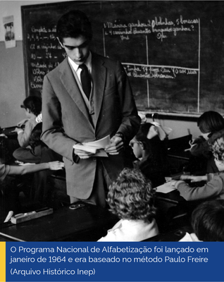 Criado na gestão do ministro da Educação e Cultura, Paulo de Tarso, o Programa Nacional de Alfabetização (PNA) foi baseado no método Paulo Freire (Decreto nº 53.465, de 21 de janeiro de 1964). Com o objetivo de promover uma alfabetização em massa, promoveu-se uma mobilização por todo o país que contou com a participação de agremiações estudantis e profissionais, associações esportivas, grupos organizados da sociedade civil, entidades religiosas, organizações governamentais civis e militares, associações patronais, empresas privadas, órgãos de difusão e o magistério. Paulo Freire foi designado para presidir a Comissão Especial para implementação do plano. “O analfabetismo não é nem uma ‘chaga’, nem uma erva daninha a ser ‘erradicada’, nem tão pouca uma ‘enfermidade’, mas uma das expressões concretas de uma situação social injusta” (Paulo Freire). 1965