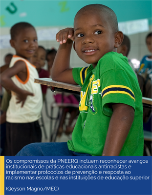 - Estruturar um sistema de metas e monitoramento e assegurar a implementação do art. 26-A da Lei nº 9.394, de 1996; - Formar profissionais da educação para gestão e docência no âmbito da educação para relações étnico-raciais (Erer) e da educação escolar quilombola (EEQ); - Induzir a construção de capacidades institucionais para a condução das políticas de Erer e EEQ nos entes federados; - Reconhecer avanços institucionais de práticas educacionais antirracistas; - Contribuir para a superação das desigualdades étnico-raciais na educação brasileira; - Consolidar a modalidade educação escolar quilombola, com implementação das Diretrizes Nacionais; e - Implementar protocolos de prevenção e resposta ao racismo nas escolas (públicas e privadas) e nas instituições de educação superior.