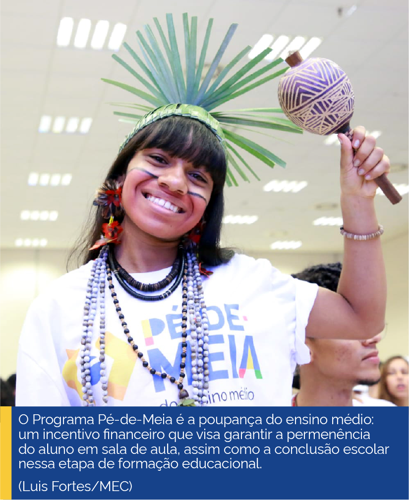 O Pé-de-Meia é um programa de incentivo financeiro-educacional, na modalidade de poupança, destinado a promover a permanência e a conclusão escolar de estudantes matriculados no ensino médio público. Por meio do incentivo à permanência escolar, o programa quer democratizar o acesso e reduzir a desigualdade social entre os jovens do ensino médio, além de promover mais inclusão social pela educação, estimulando a mobilidade social. O prgrama prevê o pagamento de incentivo mensal de R$ 200, que podem ser sacados em qualquer momento, mais depósitos de R$ 1.000 ao final de cada ano concluído, que o estudante só pode retirar da poupança após se formar no ensino médio. Considerando as dez parcelas de incentivo, os depósitos anuais e, ainda, o adicional de R$ 200 pela participação no Enem, os valores chegam a R$ 9.200 por aluno.
