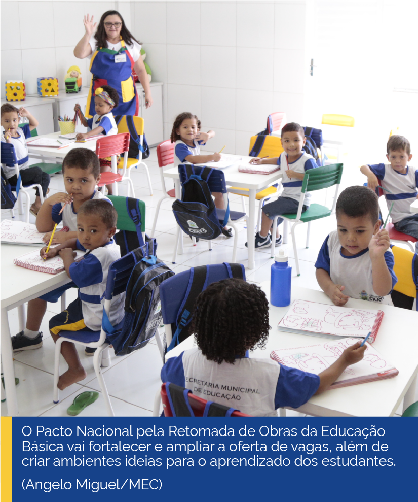 O Pacto Nacional pela Retomada de Obras da Educação Básica traduz o compromisso do governo federal em finalizar obras essenciais ao funcionamento das escolas de educação infantil, ensino fundamental e profissionalizante. Com investimentos focados na reforma, ampliação e construção de quadras esportivas cobertas, o governo federal está dotando as escolas públicas de novos equipamentos e infraestrutura de qualidade, tornando as diversas atividades pedagógicas mais interessantes e atrativas. Por meio de uma parceria do MEC com o Escritório das Nações Unidas de Serviços para Projetos (UNOPS), a iniciativa garante, inclusive, a renovação das escolas indígenas e quilombolas, com previsão de entregas ainda em 2025.