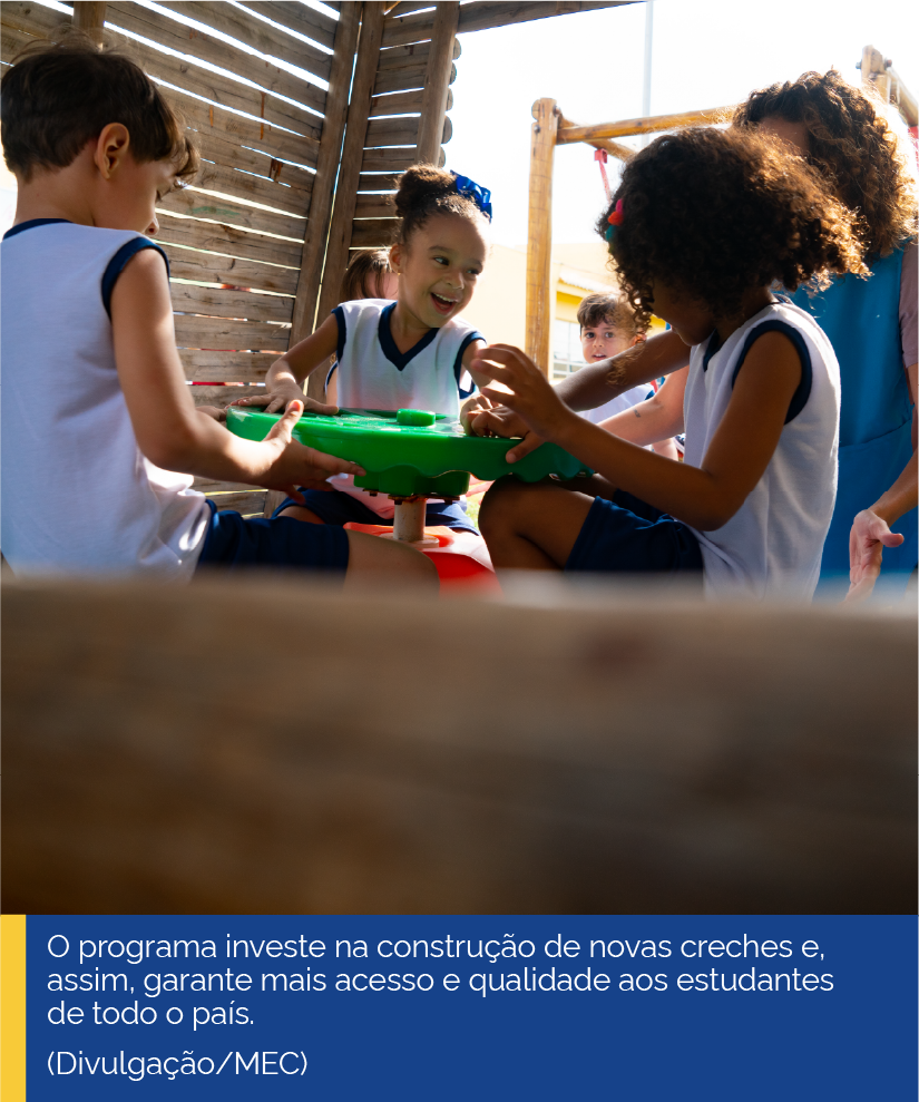 O Novo PAC chegou para transformar o Brasil, impulsionar o crescimento econômico e promover a inclusão social. E a educação básica é uma das suas maiores prioridades! Com um olhar voltado para o futuro, o programa investe na construção de novas creches, escolas em tempo integral e na aquisição de ônibus escolares, garantindo mais acesso e qualidade para os estudantes de todo o país. Essa é a primeira vez, na história do programa, que são incluídas obras para a educação básica brasileira.