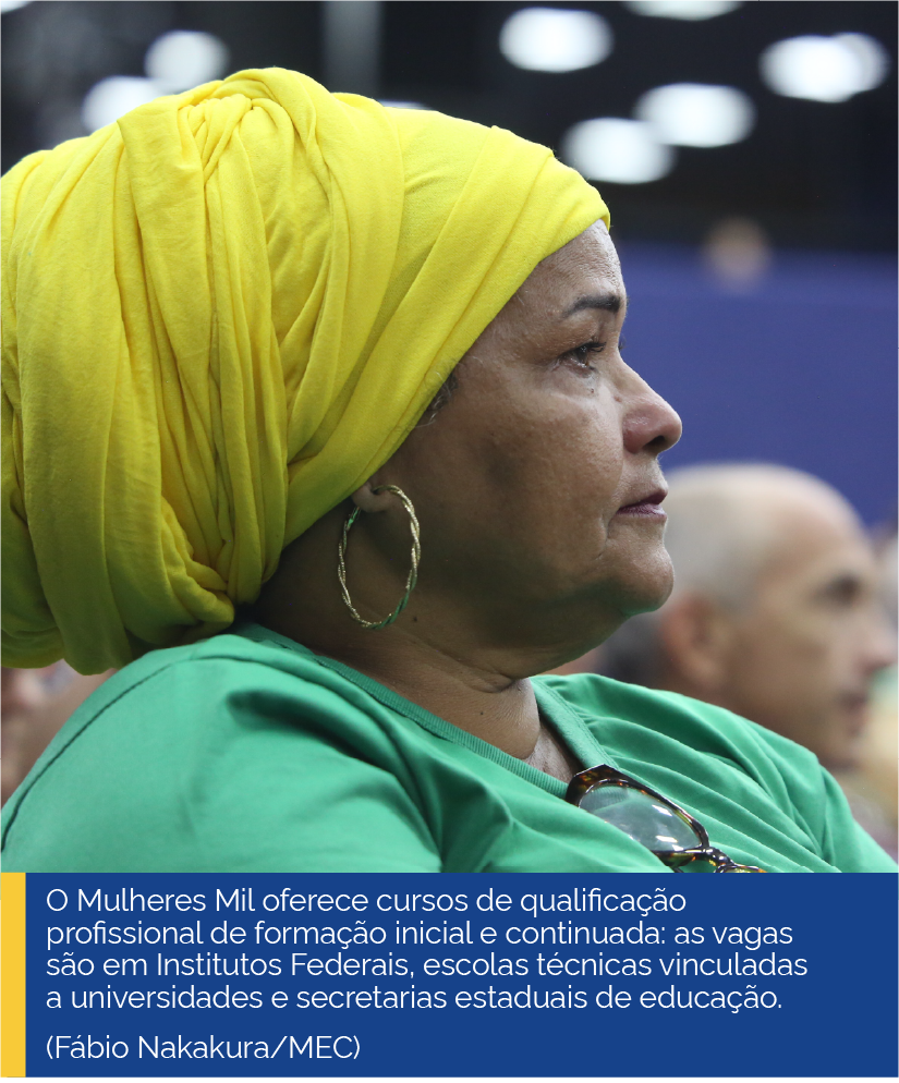 O programa Mulheres Mil reúne um conjunto de políticas públicas e diretrizes governamentais voltadas para a promoção da inclusão educacional, social e produtiva de mulheres em situação de vulnerabilidade. Com a finalidade de conectar a educação ao trabalho, e destinado às mulheres em busca de oportunidades de formação educacional, o programa é, principalmente, uma política de inclusão social e de empoderamento econômico feminino, que abre as portas para a visibilidade e a recolocação profissional das mulheres no mercado de trabalho. Executado no âmbito do Pronatec, o Mulheres Mil oferece cursos de Qualificação profissional de Formação Inicial e Continuada, entre outros. As vagas são em Institutos Federais, escolas técnicas vinculadas a universidades e secretarias estaduais de educação.