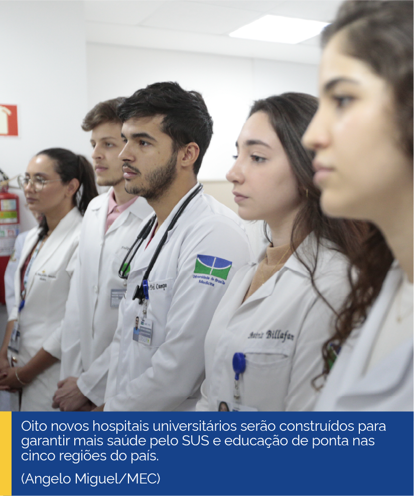 O MEC, por meio da Empresa Brasileira de Serviços Hospitalares (Ebserh), gere a rede de hospitais universitários federais do Brasil. Unindo saúde e educação, os hospitais universitários prestam serviços de qualidade e são 100% ofertados pelo Sistema Único de Saúde (SUS), além de formar os futuros profissionais da saúde em todo o país.Com investimentos do Novo PAC, serão criadas oito novas unidades hospitalares nas cinco regiões para levar acesso à saúde de qualidade em áreas carentes e, ao mesmo tempo, formar novos profissionais para cuidar dos brasileiros.