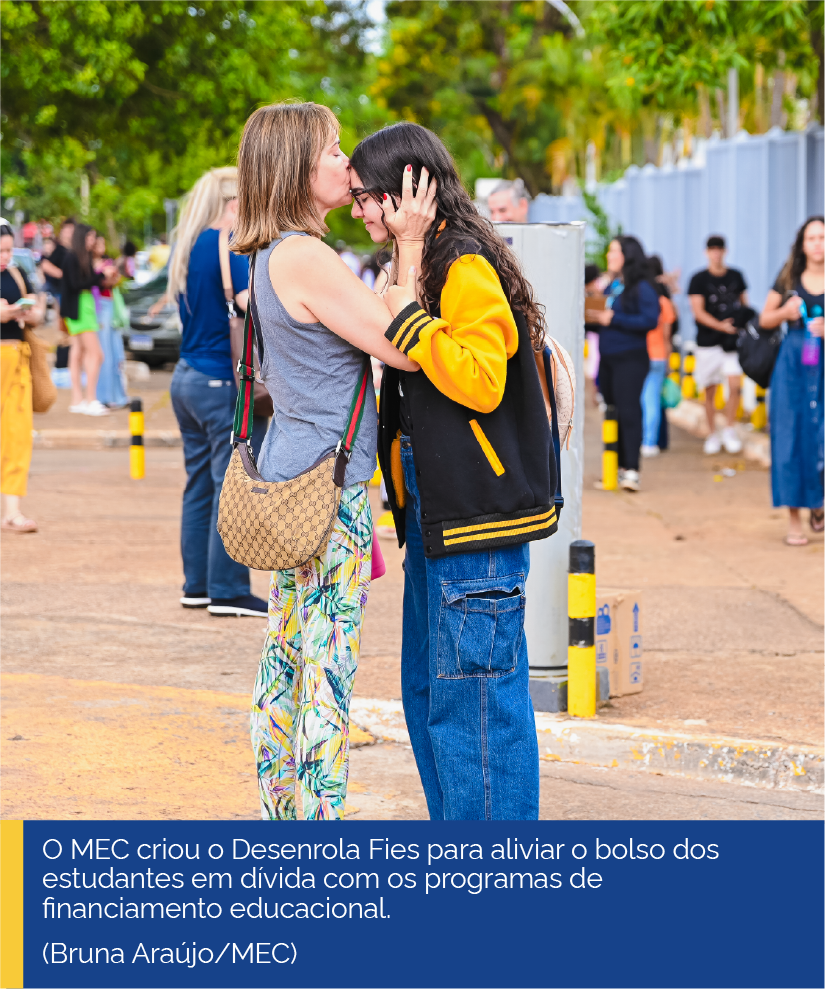 Em mais um esforço para aliviar o bolso dos estudantes em dívida com os programas de financiamento educacional, o MEC criou o Desenrola Fies. Viabilizado na esteira do Desenrola Brasil, do Ministério da Fazenda, o programa possibilitou a renegociação de dívidas com o Fies até 31/12/2024. Foram beneficiados estudantes com dívidas de contratos firmados até 2017 e inadimplentes até 30 de junho de 2023. Os descontos chegaram a até 99%, representando um grande respiro para os estudantes em situação de vulnerabilidade socioeconômica.