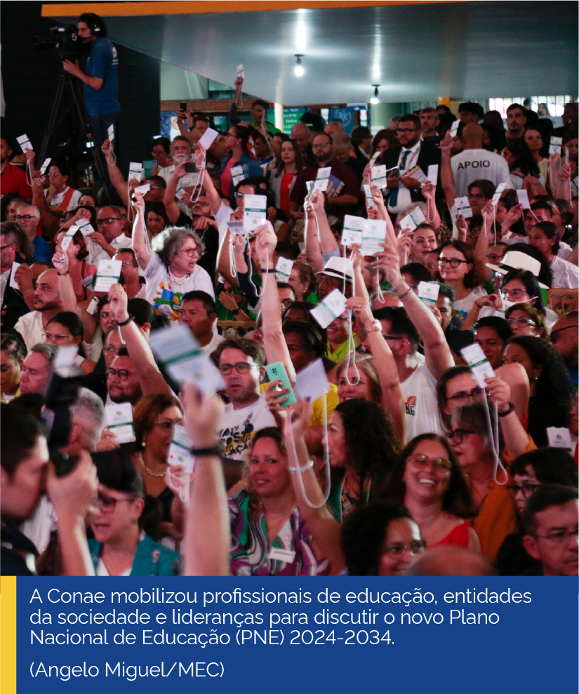 A Conferência Nacional de Educação (Conae) é um evento democrático essencial e reúne diversos setores da sociedade para discutir e contribuir com a elaboração e a implementação das políticas educacionais no Brasil. Em 2024, a Conae mobilizou profissionais de educação, entidades da sociedade e lideranças do país inteiro para discutir, principalmente, o novo Plano Nacional de Educação (PNE) 2024-2034, cuja política de Estado visa garantir a educação como direito humano, com justiça social e desenvolvimento socioambiental sustentável. Para além de avaliar o cenário da educação no país, os participantes da Conae também aprovaram as diretrizes, metas e estratégias para a educação brasileira da próxima década. A participação foi aberta a educadores, gestores, estudantes, pais e a todos os cidadãos interessados em colaborar para a construção coletiva de políticas educacionais mais justas e inclusivas.