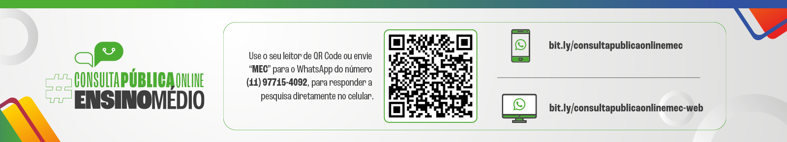 O Ministério da Educação (MEC) começa mais uma etapa da Consulta Pública para Avaliação e Reestruturação da Política Nacional do Ensino Médio. Nesta qu inta -feira, 1 5 d e junho, será oficialmente lançada a Consulta Pública o n - line , que por meio de recursos de comunicação rápida escutará estudantes, professores e gestores sobre a reestruturação do ensino médio.