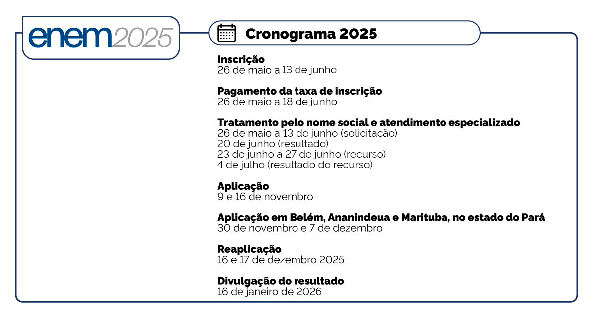Pará – As provas nos municípios de Belém, Ananindeua e Marituba (PA) terão, excepcionalmente, outras datas de aplicação: 30 de novembro e 7 de dezembro. A medida visa atender melhor os estudantes dessas localidades, em razão dos impactos logísticos da 30ª Conferência das Nações Unidas sobre Mudanças Climáticas (COP30), que ocorrerá no estado no período da aplicação regular do exame.