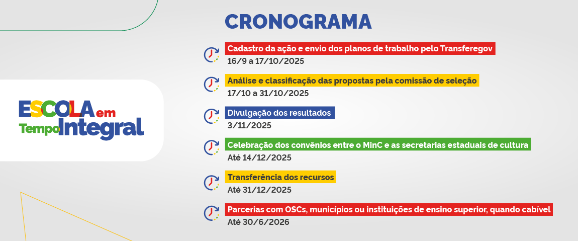 A ação faz parte do programa Escola em Tempo Integral e busca promover a circulação, a produção e a difusão da diversidade cultural e artística — com ênfase nas culturas afro-brasileiras, indígenas e africanas — nas escolas públicas, fortalecendo o desenvolvimento integral dos estudantes, bem como na formação continuada de professores, artistas e parceiros.