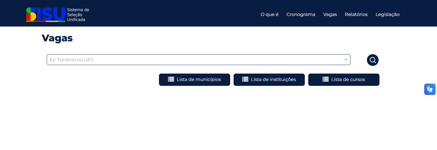 - No início do portal de consulta de vagas do Sisu, o estudante encontra diferentes formas de busca, como pesquisa aberta, lista de municípios, lista de instituições e lista completa de cursos ofertados.