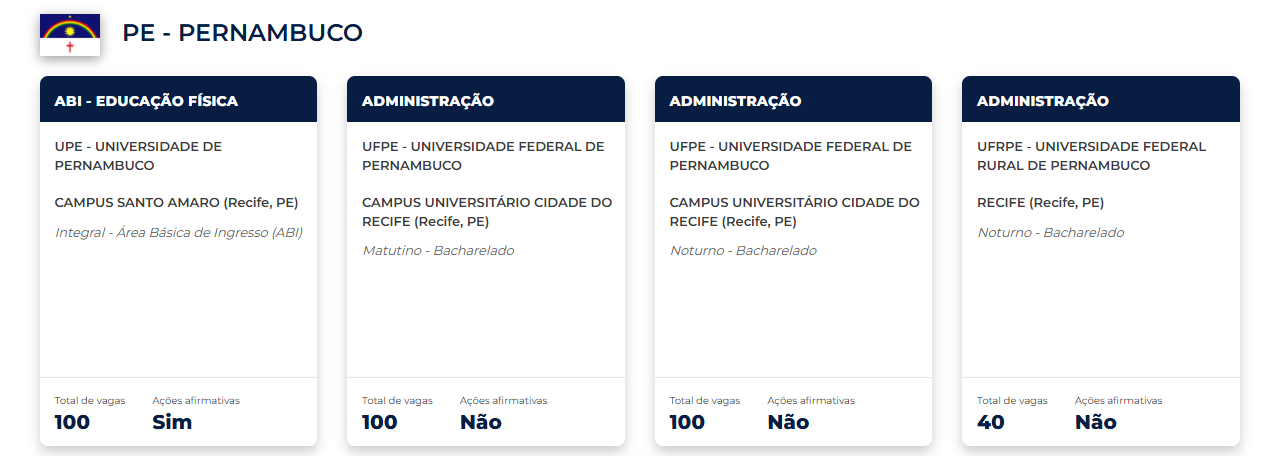 - Ao clicar em um curso específico, o estudante pode conferir informações detalhadas, como vagas para candidatos com renda familiar bruta por pessoa de até um salário mínimo; concorrência ampla; e ações afirmativas próprias da instituição. Também é possível verificar a distribuição de vagas por cotas — como pretos, pardos e indígenas (PPI); quilombolas (Q); pessoas com deficiência (PcD); e estudantes de escola pública (EP) — além do grau de formação e do turno ou formato do curso.