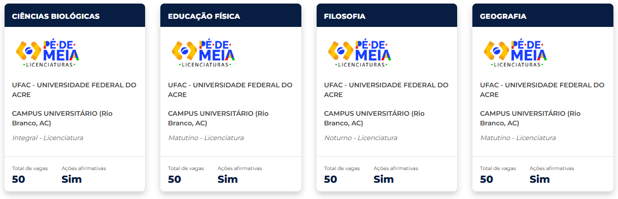 - A plataforma também identifica os cursos que oferecem vagas vinculadas ao programa Pé-de-Meia Licenciaturas, que concede incentivo financeiro a estudantes de licenciatura com média igual ou superior a 650 pontos no Enem. O programa garante aos estudantes uma bolsa de R$ 1.050 mensais, sendo R$ 700 disponíveis para saque imediato e R$ 350 depositados como poupança durante todo o curso.