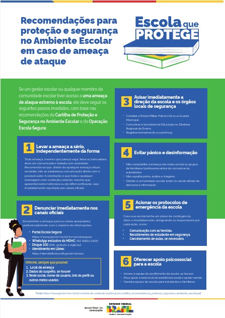 Confira o cartaz com recomendações para a proteção e segurança das escolas em caso de ameaça de ataque.