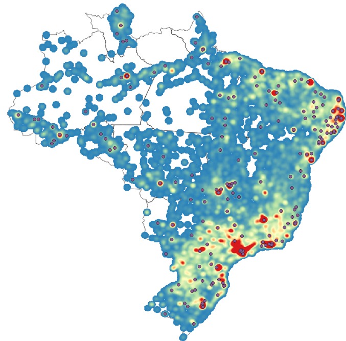 O mapa que você está vendo mostra, com cores mais quentes (como vermelho e laranja), as áreas do Brasil onde há maior concentração de escolas estaduais de Ensino Médio. Quanto mais forte a cor, mais escolas há naquela região.