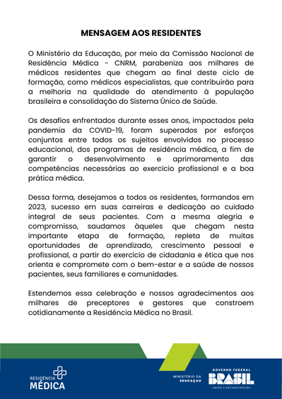 - NOTA INFORMATIVA Nº 1/2023/CGRS/DDES/SESU/SESU-MEC - A presente Nota Informativa trata da diferenciação entre Residência Médica (RM) e outras modalidades de pós-graduação lato-sensu (PGLS) no tocante ao aparato normativo que define o seu funcionamento e à titulação obtida pelos egressos, a qual tem como consequência prerrogativas legais para o exercício profissional.