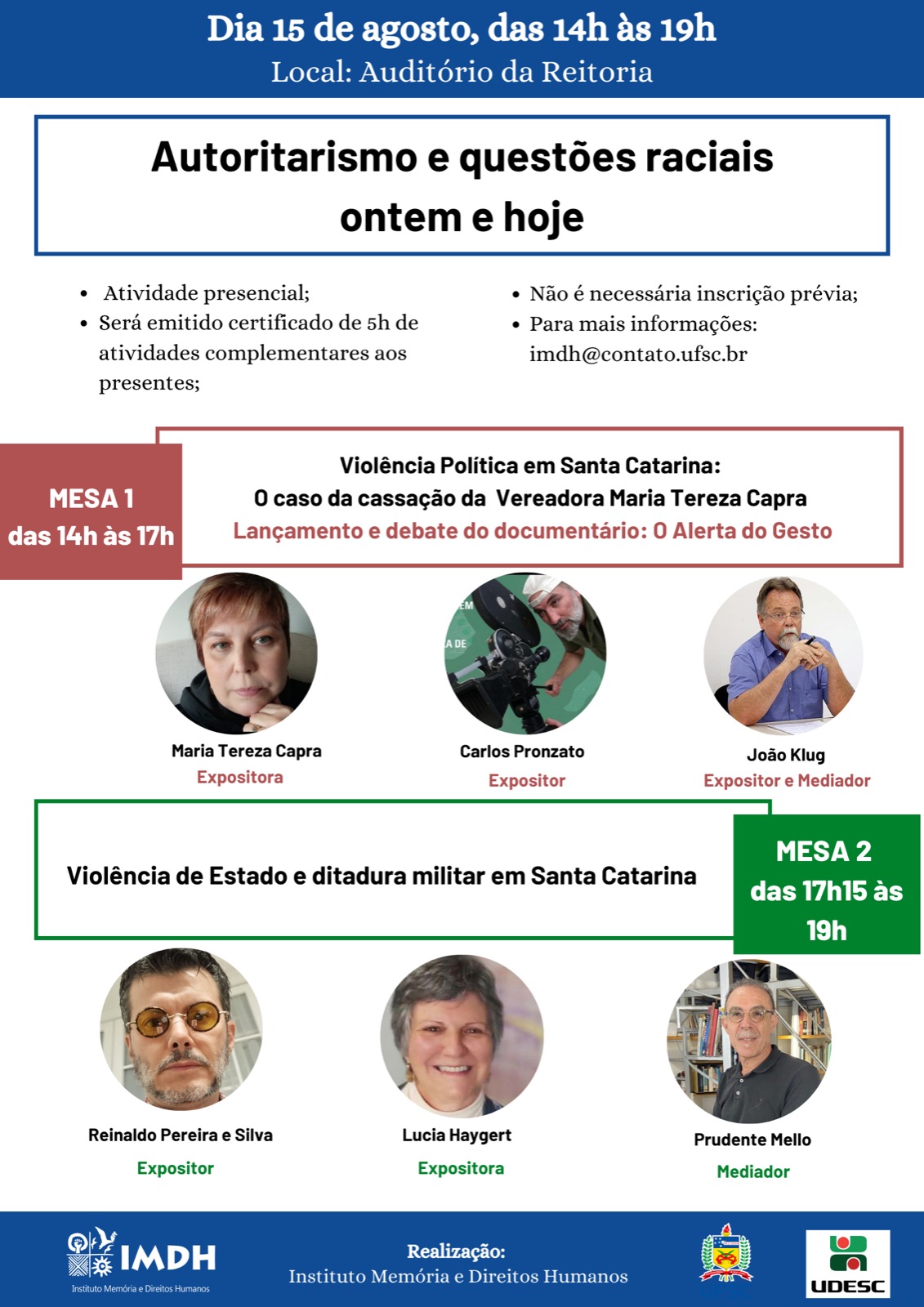 Uma das mesas vai tratar da temática Violência Política em Santa Catarina: o caso da cassação da vereadora Maria Tereza Capra, com o lançamento e debate do documentário O Alerta do Gesto . João Klug, professor de História da UFSC, será mediador e expositor.