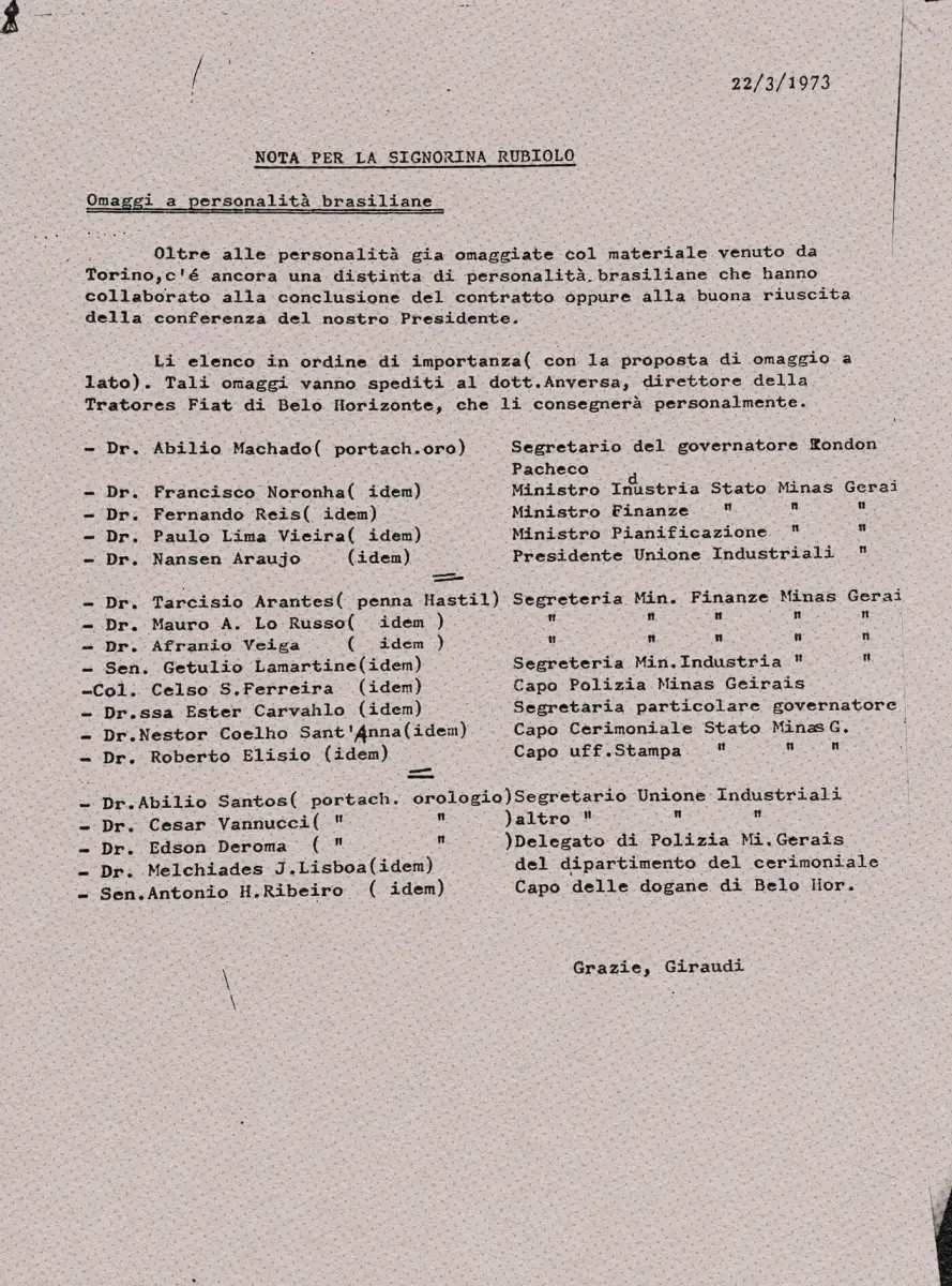 Uma das listas tem 18 nomes de agraciados com brindes, entre os quais está o então secretário de governo de Minas Gerais Abílio Machado, o qual o comunicado interno da empresa orientava que fosse presenteado com um “mimo de ouro”, presente que se repete a várias outras autoridades. Também aparecem na lista o chefe da polícia de Minas, coronel Celso Ferreira, um delegado da cúpula da Polícia Civil, Edson Derona, e vários secretários de governo. Os brindes eram parte dos preparativos para a visita do presidente da montadora ao Brasil, Giovanni Agnelli, em março de 1973, para fechar o acordo sobre a construção da fábrica em Betim. Ele foi recebido pelo então ministro das Minas e Energia Pratini de Moraes. Há, no comunicado, recomendação expressa para que se agraciasse o presidente da República, general Emílio Garrastazu Médici com a “1ª macchina Fiat”. Gustavo Seferian diz que, ao que tudo indica, se tratava de uma réplica em miniatura de um trator da Fiat, cujas características não foram explicadas no comunicado.