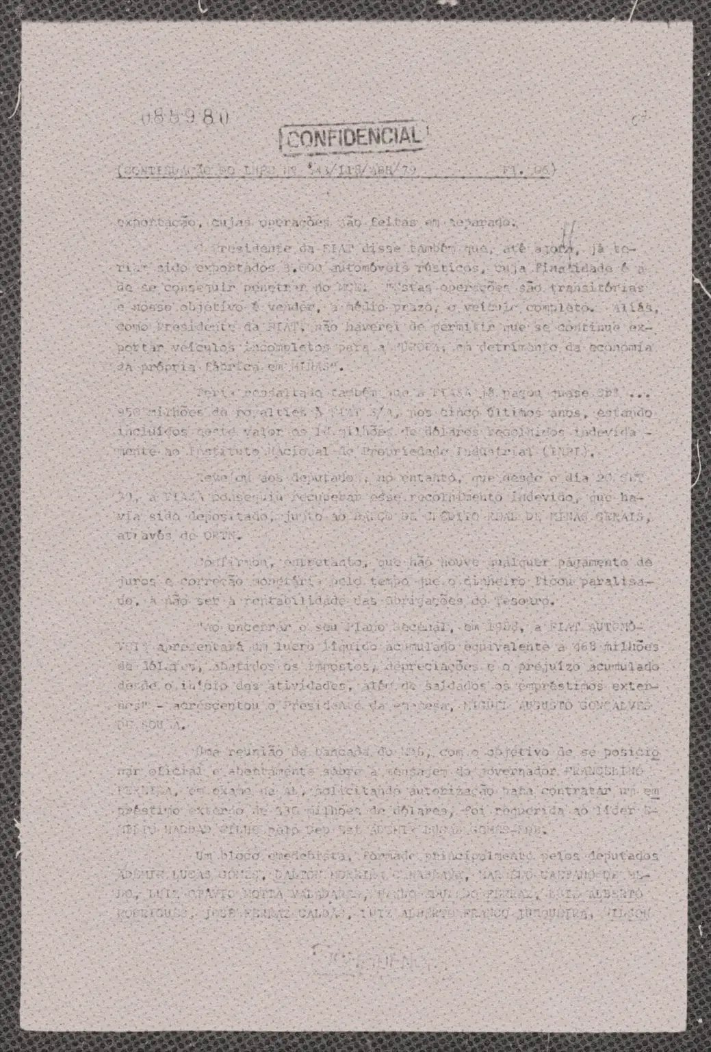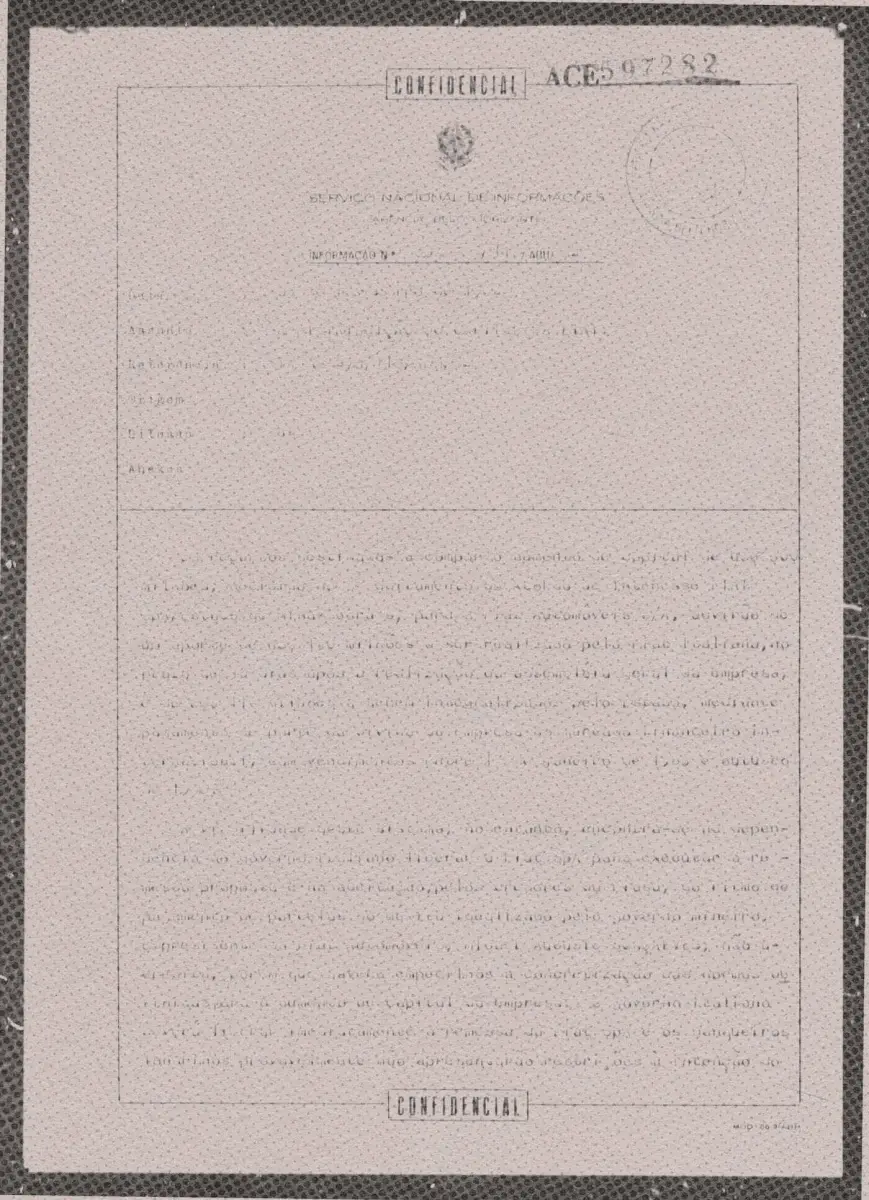 Documento do Serviço Nacional de Informações sobre investimentos da Fiat na unidade em Betim