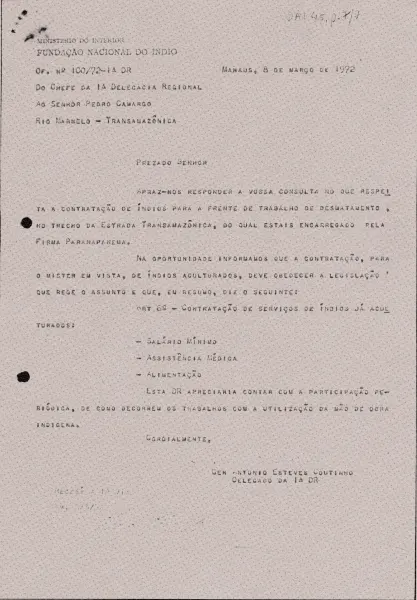 Ofício enviado pela Funai, em 8 de março de 1972, sobre a contratação de indígenas para trabalharem na construção da Transamazônica