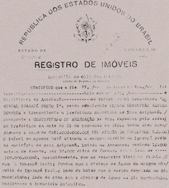 Há também indícios de que a terra estava sendo grilada. Em novembro de 1969, um relatório confidencial do Serviço Nacional de Informações (SNI ) apontava “problema na legitimidade dos documentos apresentados” por Plínio em relação ao título de posse de um seringal em Igarapé Preto, no município Novo Aripuanã (AM). O SNI argumentava ter “fundadas razões” para crer numa “origem suspeita” do registro. Três anos depois, Plínio transferiu seus direitos de posse à Mineração Angelim, de propriedade dos então donos da Paranapanema, Octavio Lacombe e José Carlos de Araújo. Hoje é uma empresa de capital aberto e tem entre seus acionistas a Caixa Econômica Federal e a multinacional Mineração Buritirama S.A.