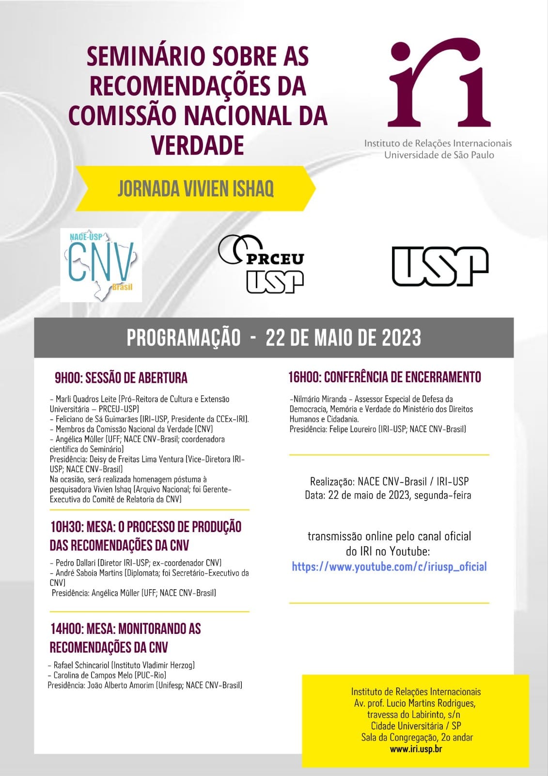 Jornada Vivien Ishaq ocorrerá no dia 22 de maio no Instituto de Relações Internacionais da USP em São Paulo (SP) com transmissão online em: https://www.youtube.com/c/iriusp_oficial